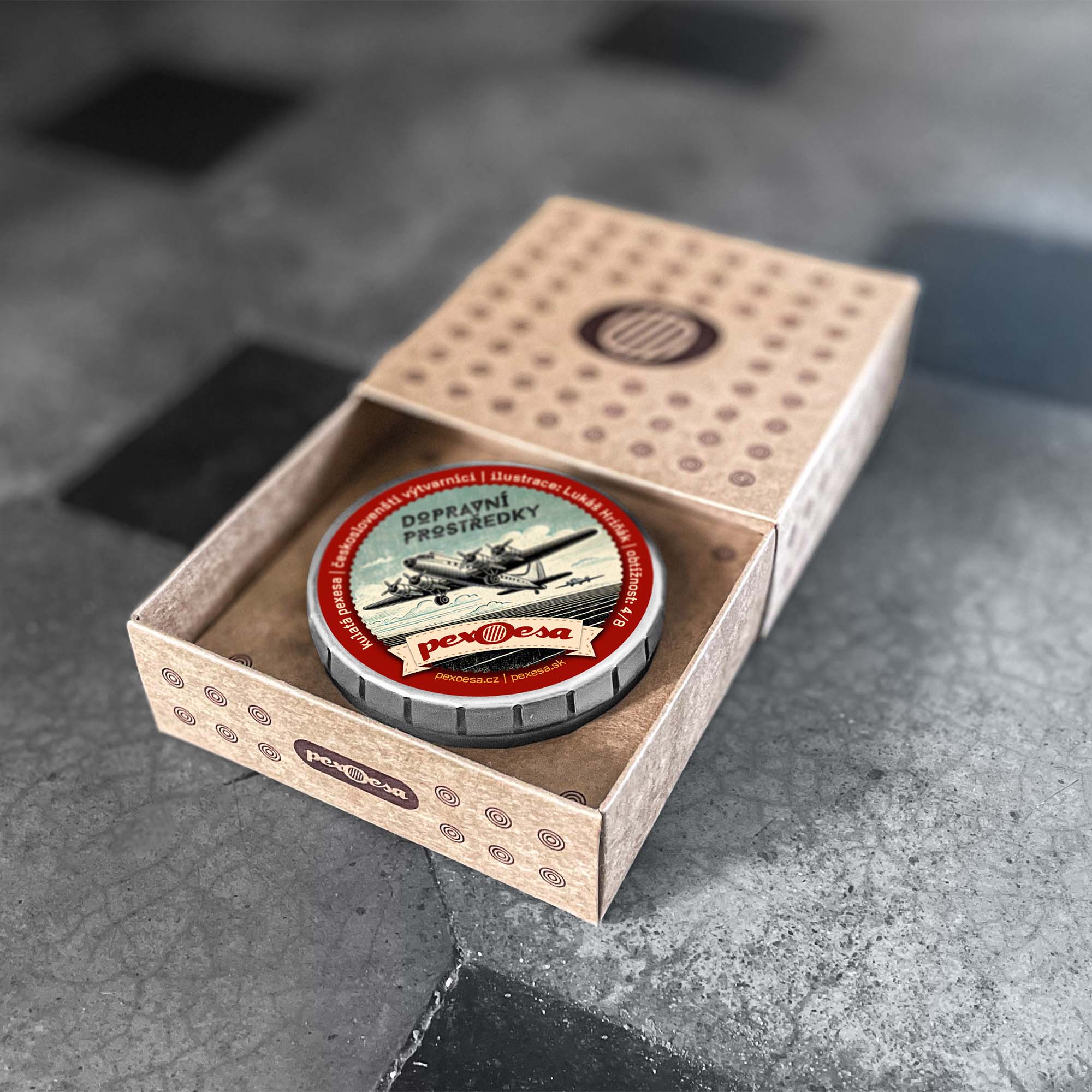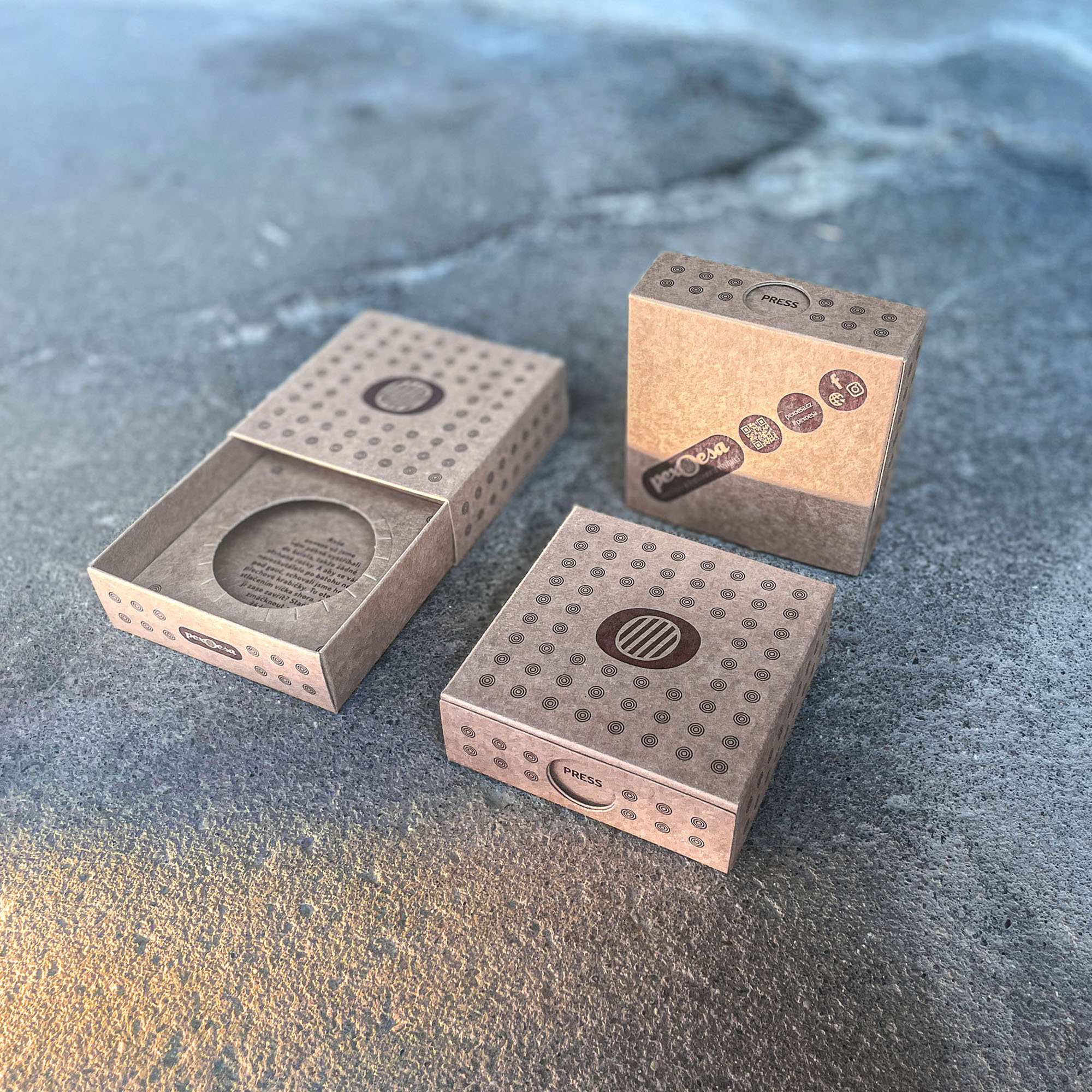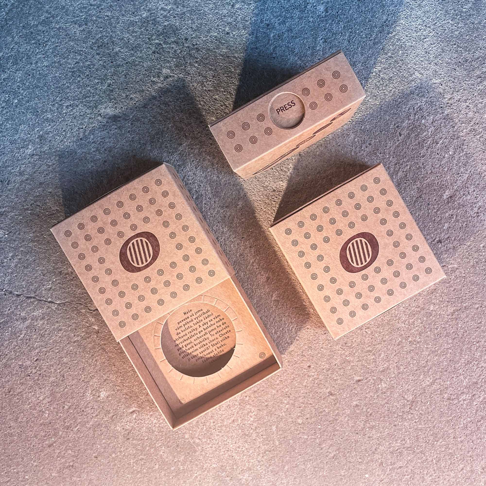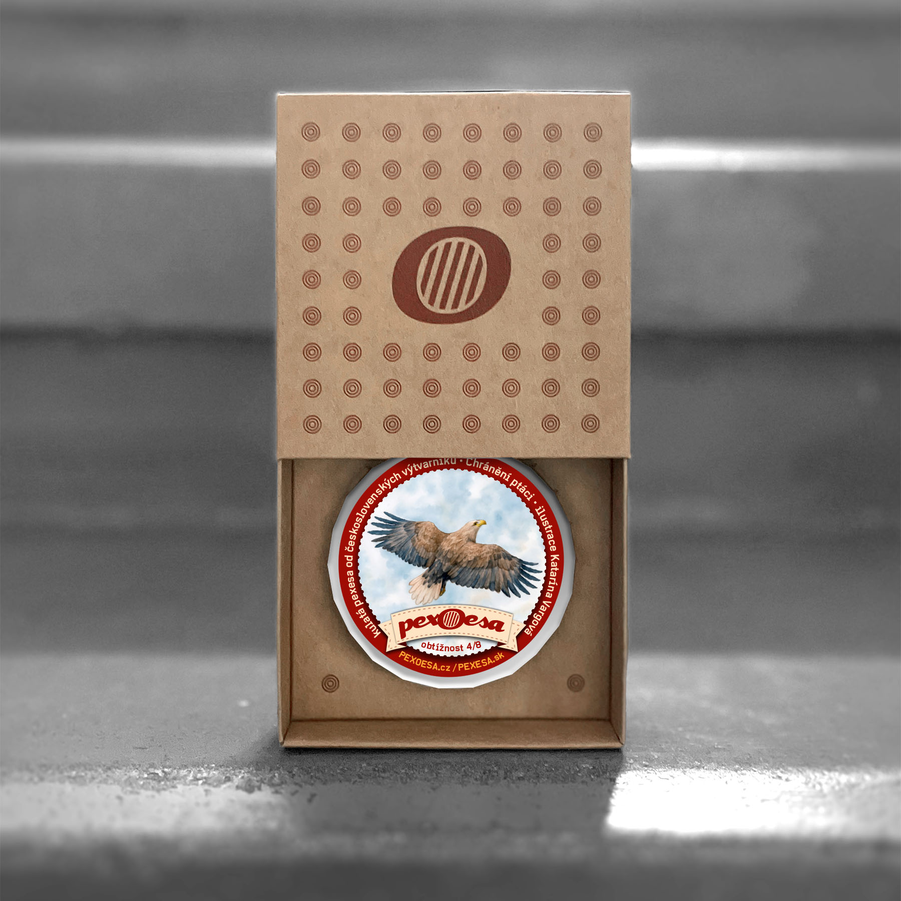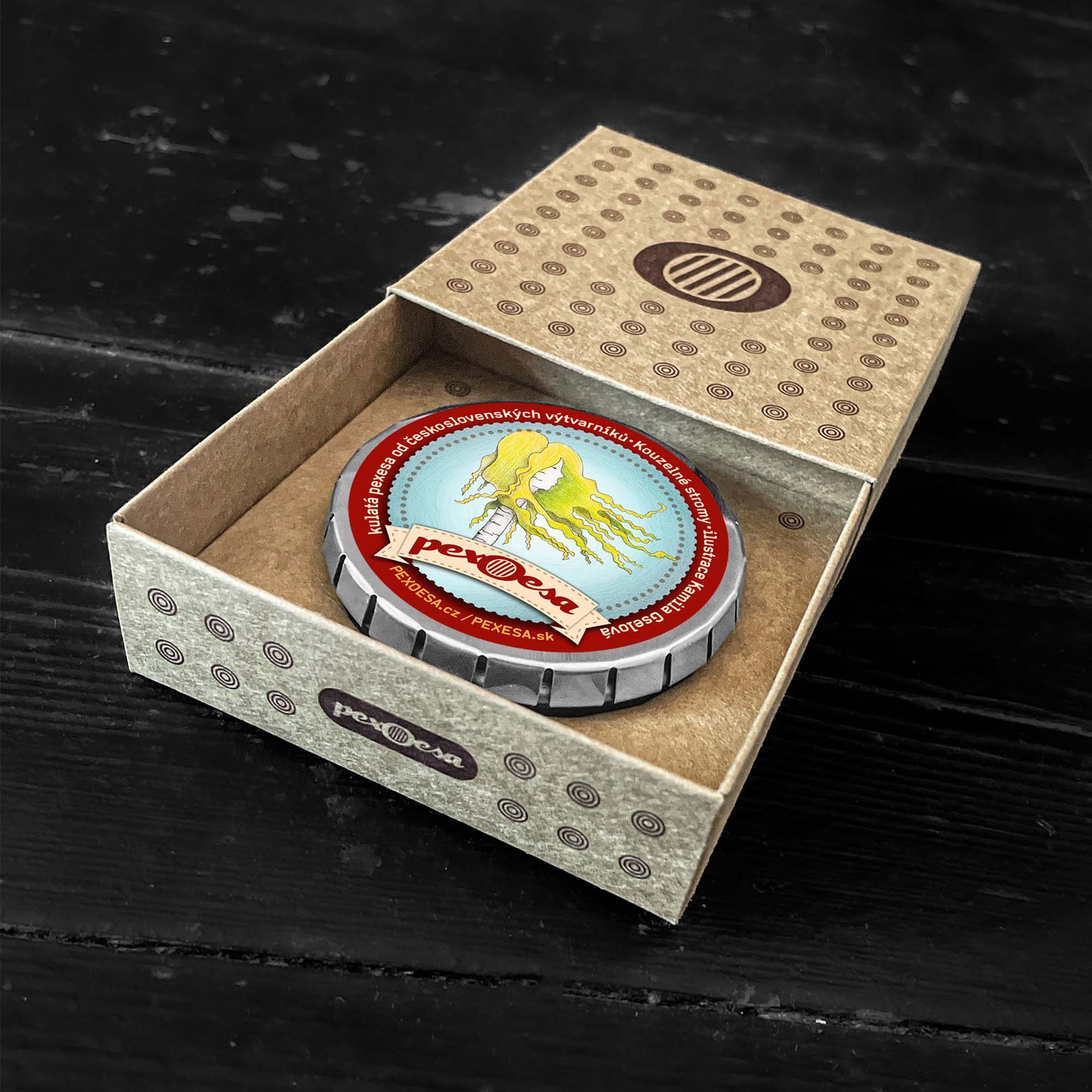 Krabička je vyrobena z pevného kraftového papíru přírodní barvy. Má vysouvací konstrukci, která působí jednoduše a současně prémiově. Povrch je decentně potištěn jemnými kruhovými značkami, které odkazují na kulatý tvar pexes a dodávají krabičce originální vzhled. Je elegantní, střídmá a příjemná na dotek – ideální pro dárkové zabalení nebo pro sběratele, kteří chtějí svá pexesa uchovávat jednotně.