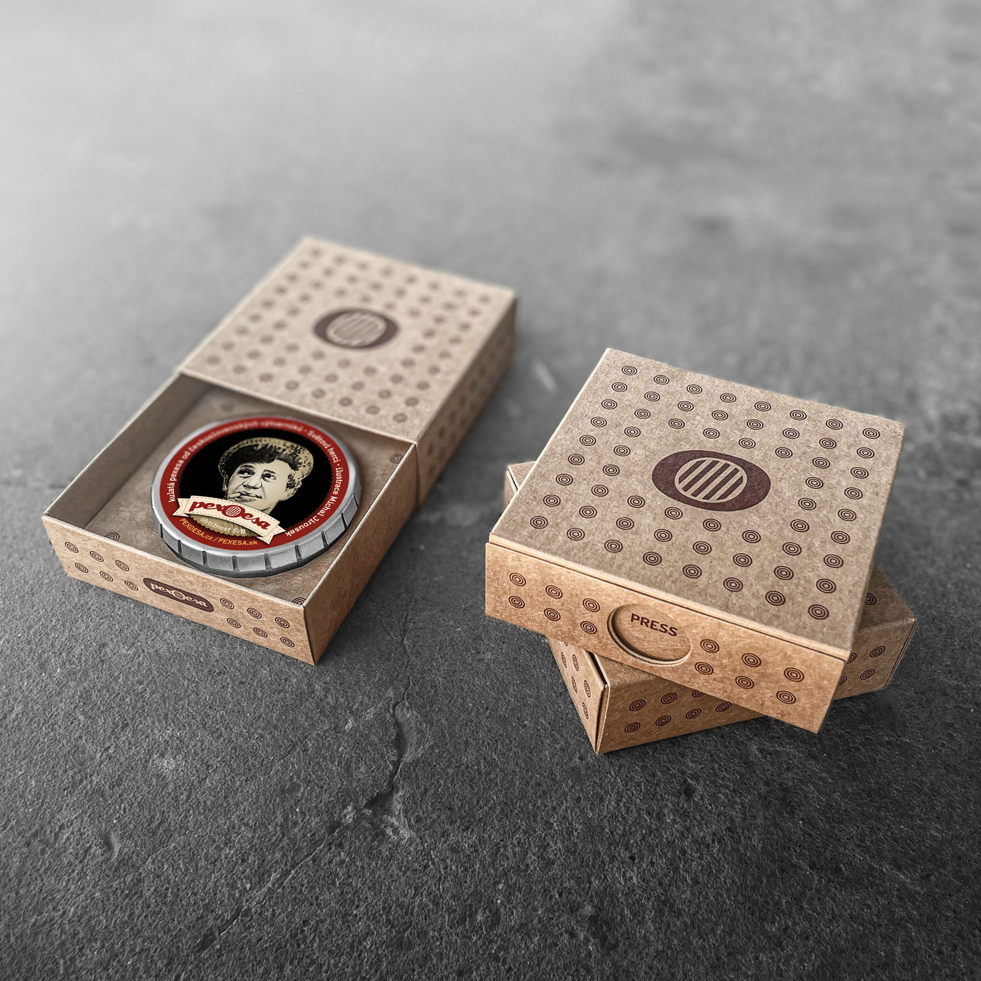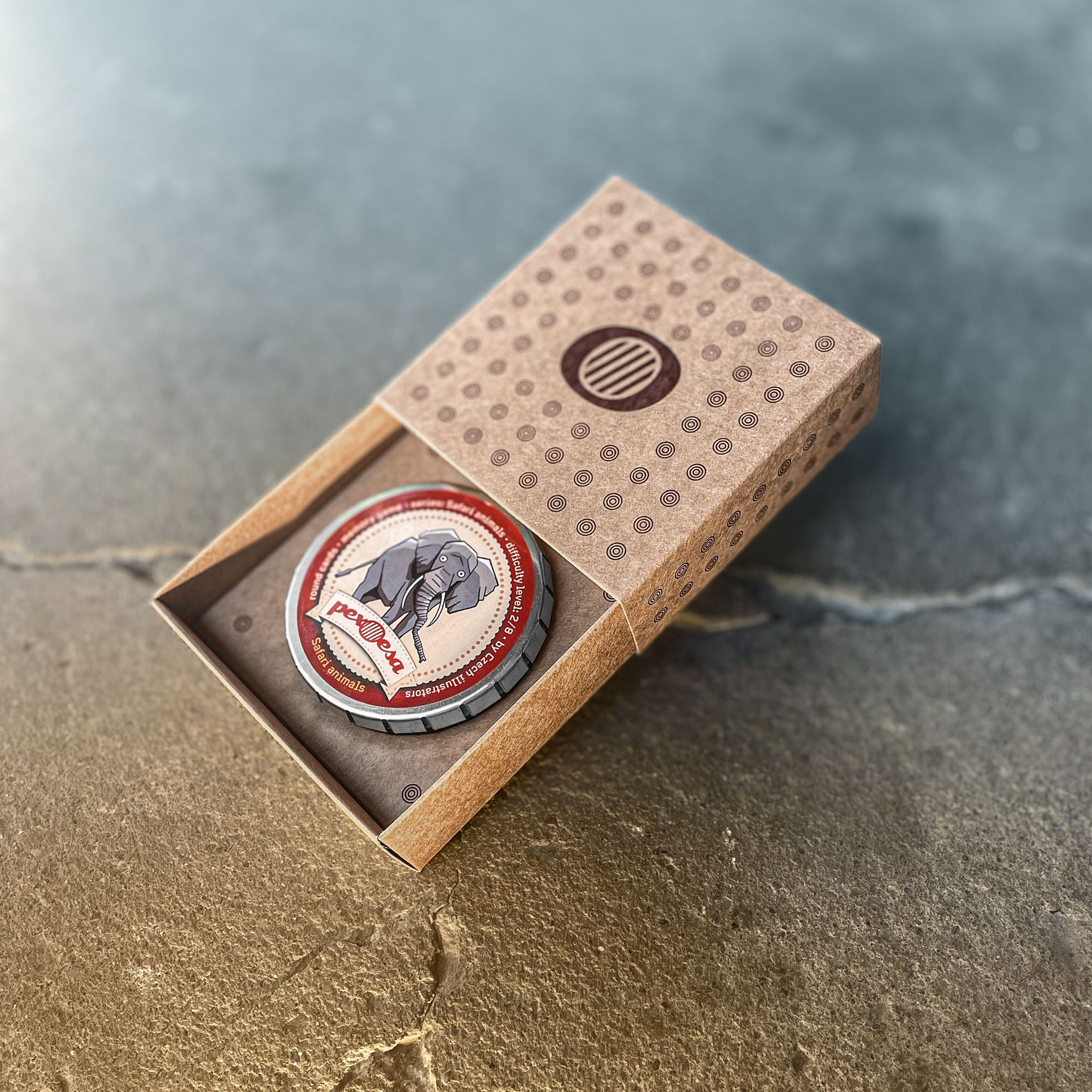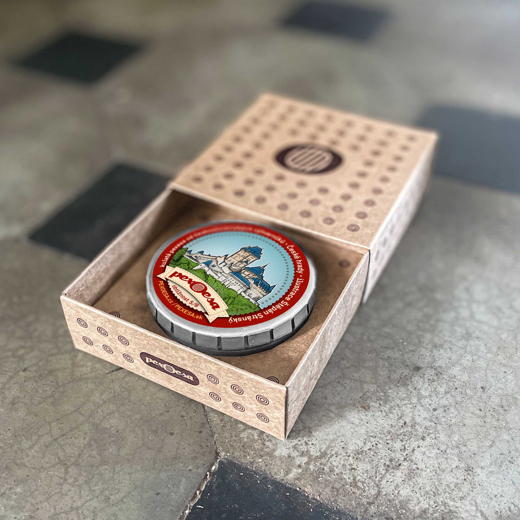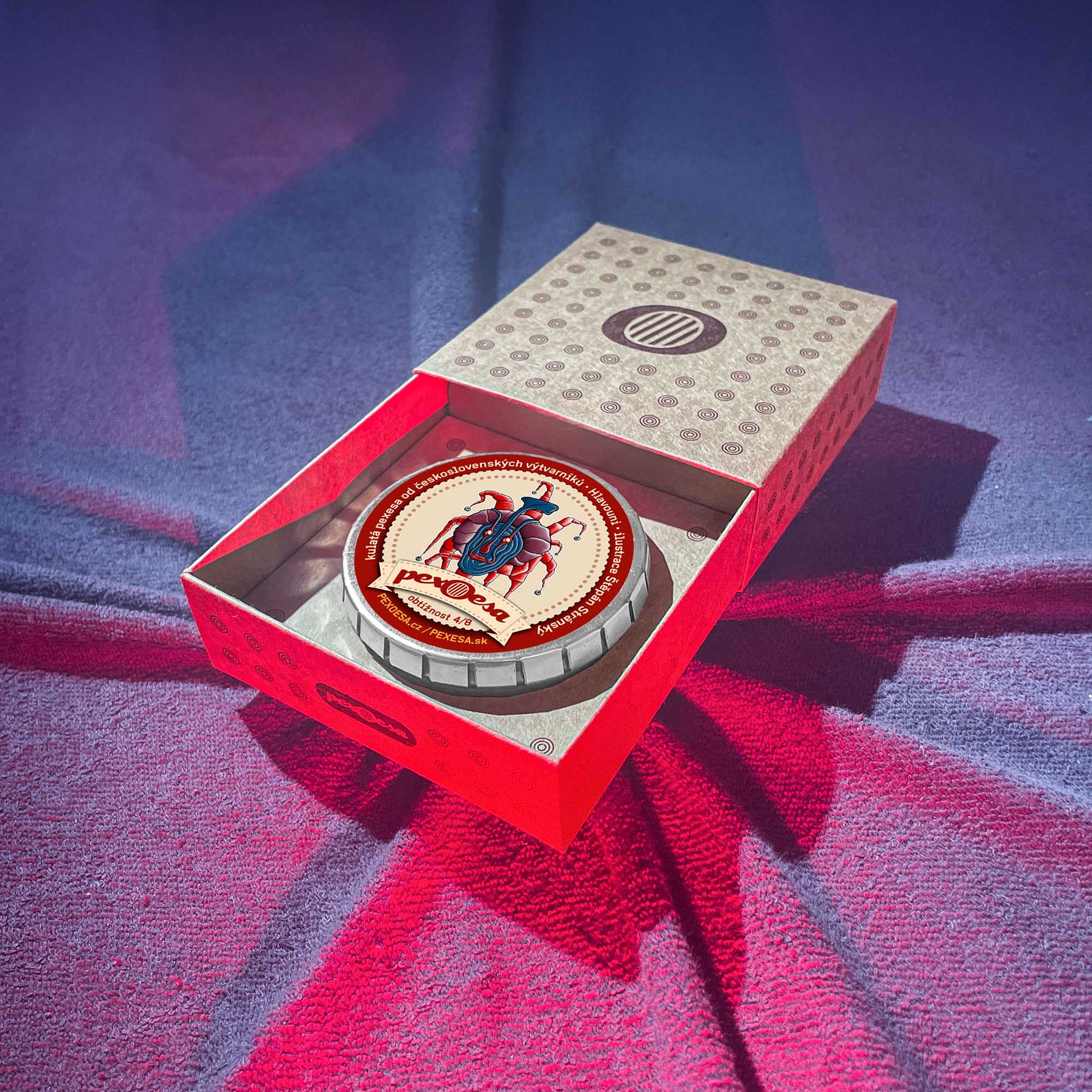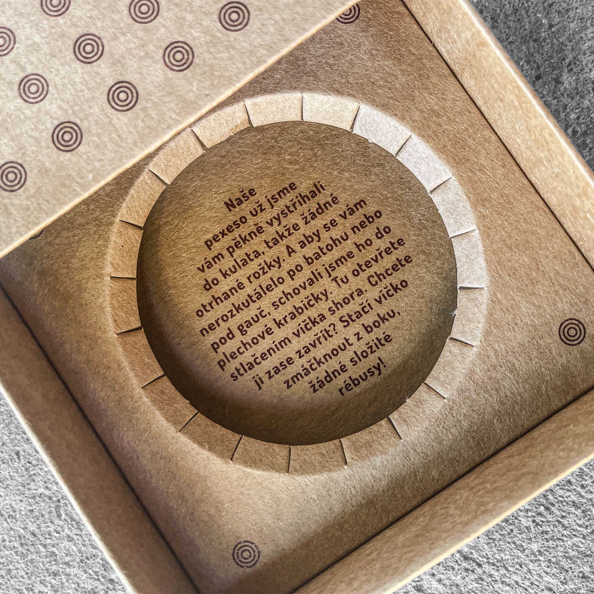 Krabička je vyrobena z pevného kraftového papíru přírodní barvy. Má vysouvací konstrukci, která působí jednoduše a současně prémiově. Povrch je decentně potištěn jemnými kruhovými značkami, které odkazují na kulatý tvar pexes a dodávají krabičce originální vzhled. Je elegantní, střídmá a příjemná na dotek – ideální pro dárkové zabalení nebo pro sběratele, kteří chtějí svá pexesa uchovávat jednotně.