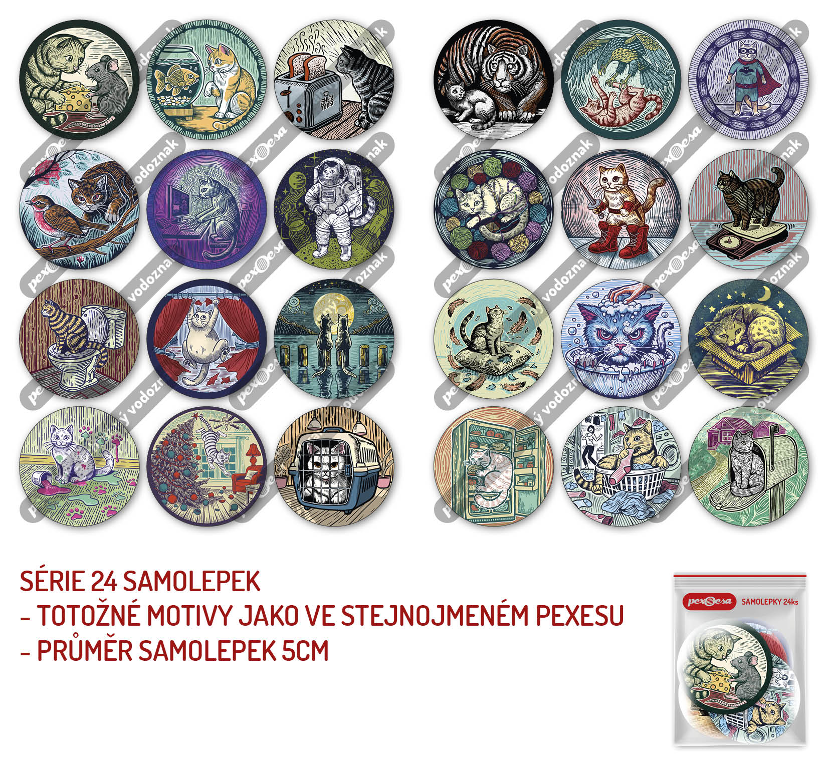 Samolepky Hravé kočky přinášejí sbírku 24 veselých motivů, které s nadsázkou zachycují život domácích koček.