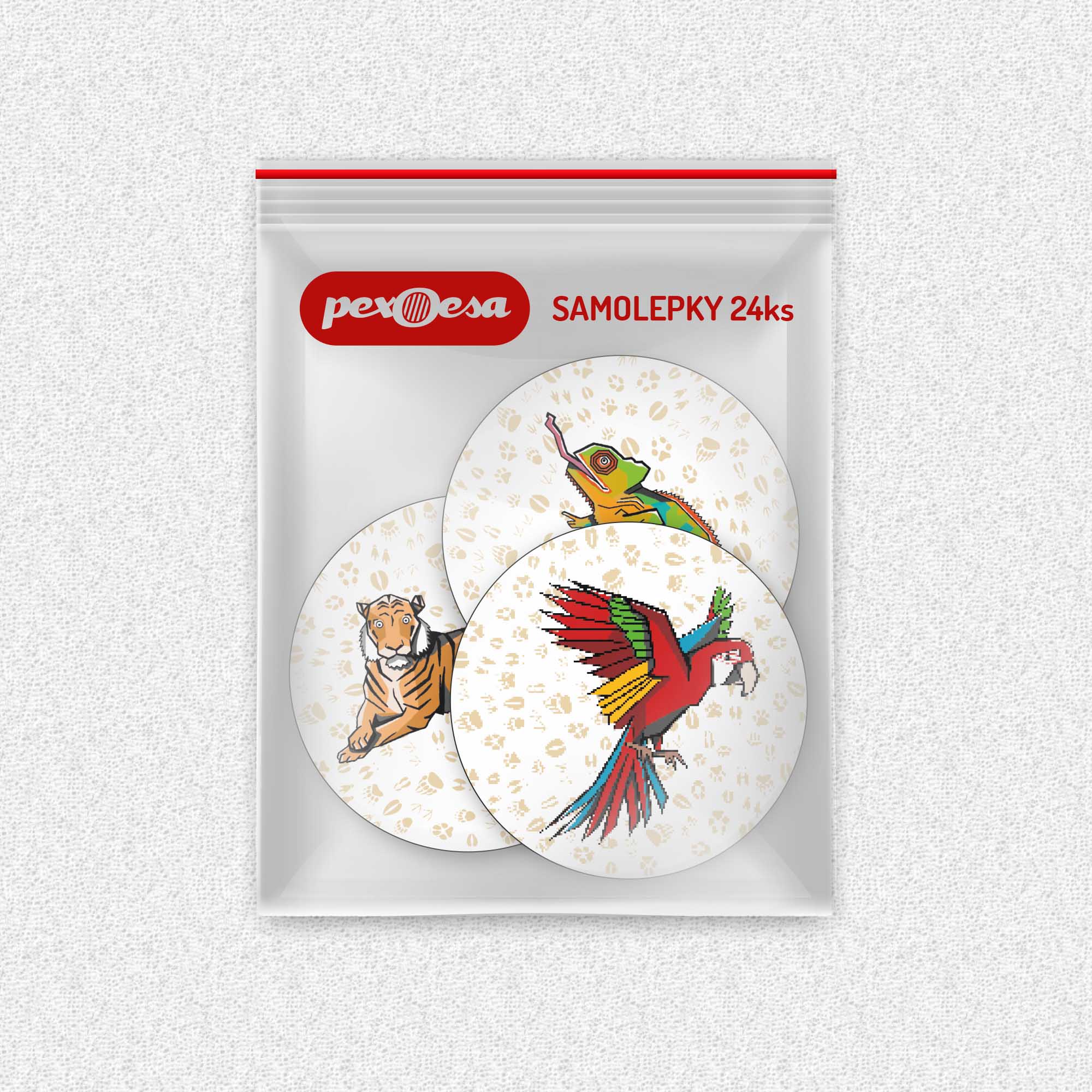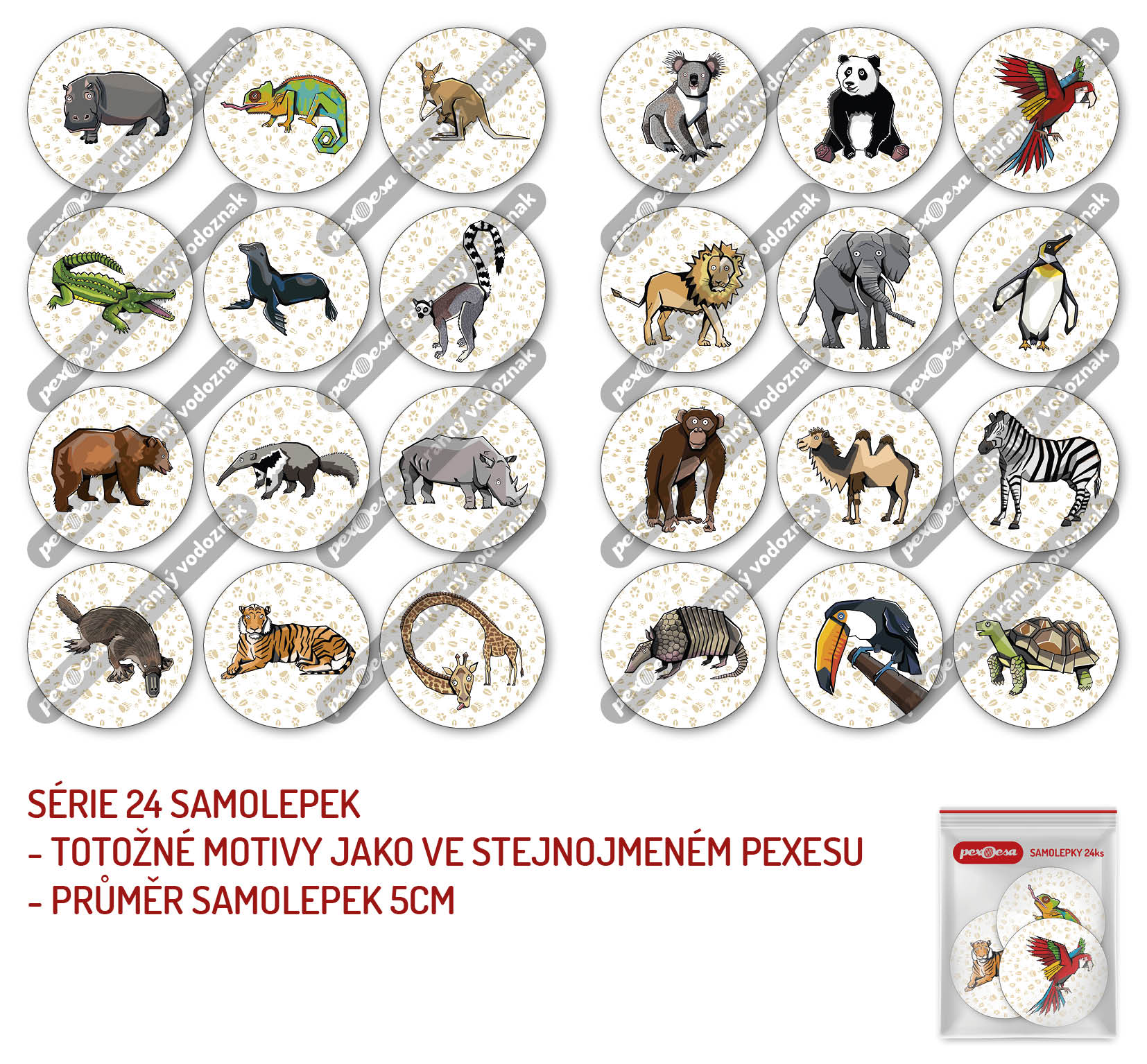 samolepky Safari zvířátka – Vydej se na malou výpravu do divočiny s kolekcí 24 kulatých samolepek – Safari zvířátka.